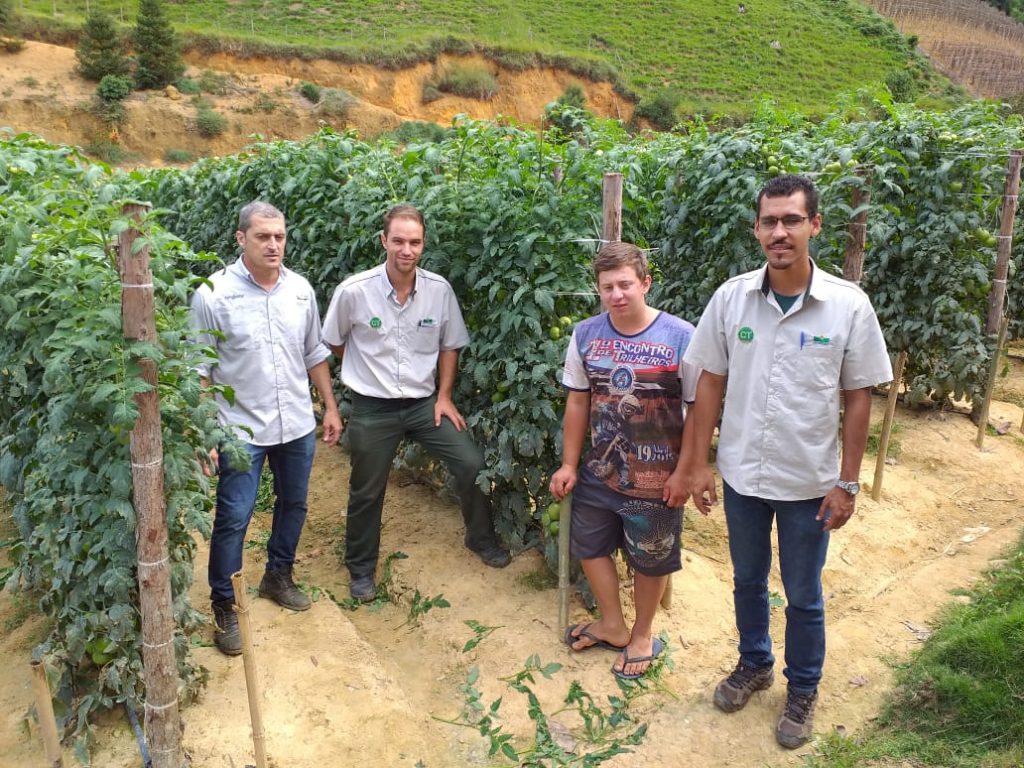 A família Ponath, de Santa Maria de Jetibá, já está na sexta lavoura de tomate com utilização das sementes e outros produtos adquiridos junto à Coopeavi. Com a consultoria técnica, os produtores, dentre eles Fernando Ponath (de bermuda) seguem todas as recomendações para obter sucesso na produção do fruto.