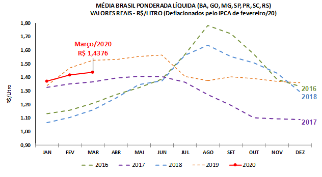O preço do leite pago ao produtor em março (referente ao volume captado em fevereiro) registrou alta de 1,4% em relação ao mês anterior, chegando a R$ 1,4376/litro na “Média Brasil” líquida, segundo pesquisas do Cepea (Centro de Estudos Avançados em Economia Aplicada), da Esalq/USP. O movimento de alta nos valores do leite no campo ocorre desde dezembro/19 e está atrelado à concorrência entre laticínios para garantir a compra de matéria-prima num contexto de oferta limitada.