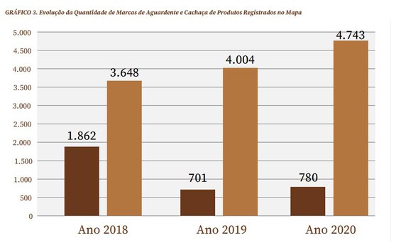 O número de produtores de aguardente e cachaça registrados no Brasil aumentou 4,14% em 2020, quando comparado com o ano anterior, chegando a 1.131 estabelecimentos. O número de produtores de cachaça aumentou 6,8%, o que compensou a retração de 3,5% do número de produtores de aguardente no período.