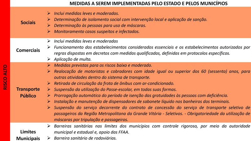 As medidas qualificadas de prevenção à disseminação do coronavírus são estabelecidas em portaria da Sesa e têm validade até o dia 3 de maio, quando será realizada uma nova atualização do Mapa de Gestão de Risco. Os municípios de Cariacica e Viana foram classificados como Risco Alto por fazerem parte da Região Metropolitana e não ser possível controlar a interação social pela proximidade com os demais municípios.