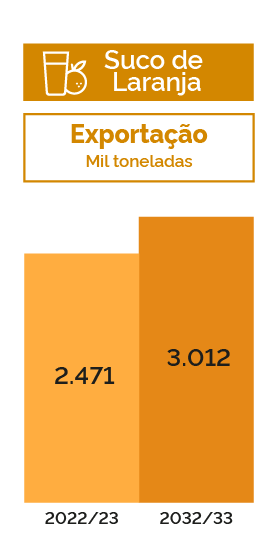 Já as exportações de suco de laranja devem passar de 2,5 milhões de toneladas, em 2022/23, para 3 milhões de toneladas ao final do período das projeções. Isso representa um aumento de 21,9% na quantidade exportada. O faturamento neste ano (janeiro a junho) foi de US$ 1 bilhão para uma quantidade de 1,3 milhão de toneladas exportadas, com 75,8% na participação mundial.