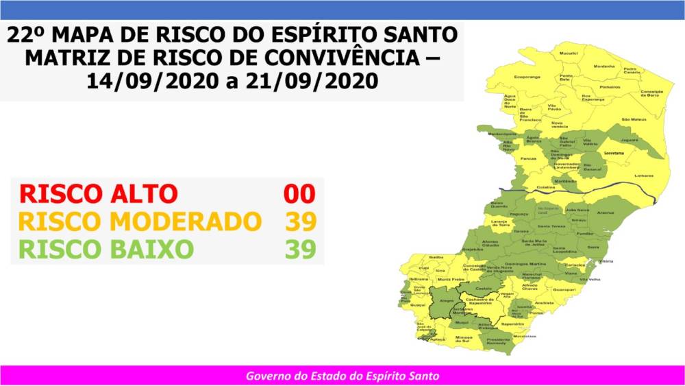 O novo Mapa de Risco Covid-19, anunciando pelo Governo do Estado na última sexta-feira (11), e que terá vigência entre amanhã (14) e o domingo (20), apontou que 39 municípios capixabas estão classificados em risco baixo e outros 39 estão em risco moderado para a transmissão de coronavírus. Não há nenhum município em risco alto. O Mapa foi construído seguindo a metodologia da 5ª Fase da Matriz de Risco de Convivência, anunciada no final de agosto.