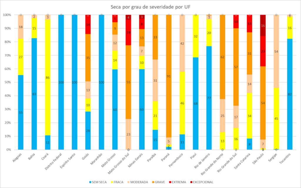 Cinco estados registraram seca em 100% do território no último mês: Mato Grosso do Sul, Rio Grande do Norte, Rio Grande do Sul, São Paulo e Sergipe. Três unidades da Federação ficaram livres do fenômeno em janeiro: Distrito Federal, Espírito Santo e Maranhão. Os demais 13 estados acompanhados pelo Monitor apresentam entre 17,3% e 97,9% de suas áreas com o fenômeno, sendo que para percentuais acima de 99% considera-se a totalidade dos territórios com seca.
