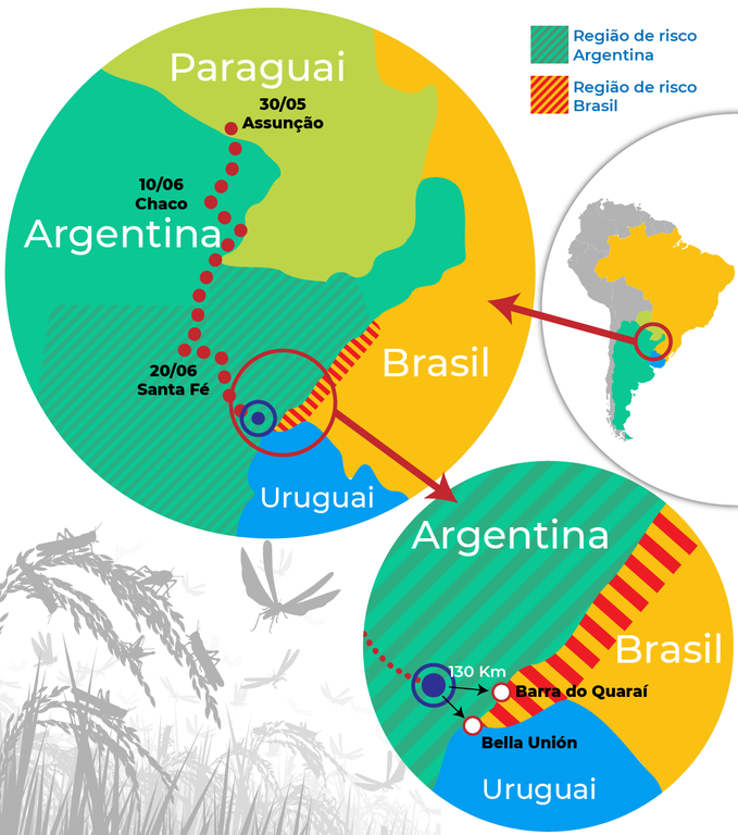 O monitoramento feito pelo Ministério da Agricultura, Pecuária e Abastecimento (Mapa) indica que, até o momento, estão mantidas as previsões sobre a rota da nuvem de gafanhotos, que não entrou em território brasileiro. O trabalho do Mapa segue em ritmo de alerta em conjunto com as equipes técnicas das Superintendências Federais de Agricultura e dos órgãos estaduais de Defesa Agropecuária nos estados do Paraná, Rio Grande do Sul e de Santa Catarina, além de unidades federais de vigilância agropecuária localizadas na fronteira com o Rio Grande do Sul.