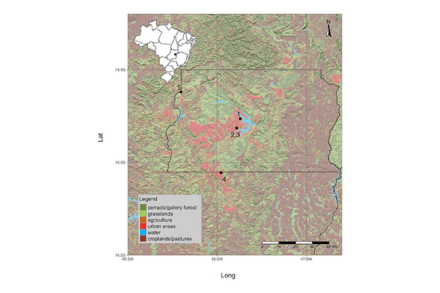 AMOSTRAS – Para realizar o estudo, os pesquisadores capturaram morcegos em cinco colônias encontradas em edificações urbanas, duas em Brasília e duas em cidades da divisa do Distrito Federal com Goiás. Uma colônia de Nyctinomops laticaudatus foi localizada na Universidade de Brasília (Asa Norte/Brasília); uma colônia de Cynomops planirostris e uma de Molossus molossus, no bloco comercial 405 Sul (Asa Sul/Brasília); uma colônia de Eumops perotis, em um prédio em Valparaíso (GO); e uma colônia de Histiotus diaphanopterus, no Residencial Vendinha, em Padre Bernardo (GO).