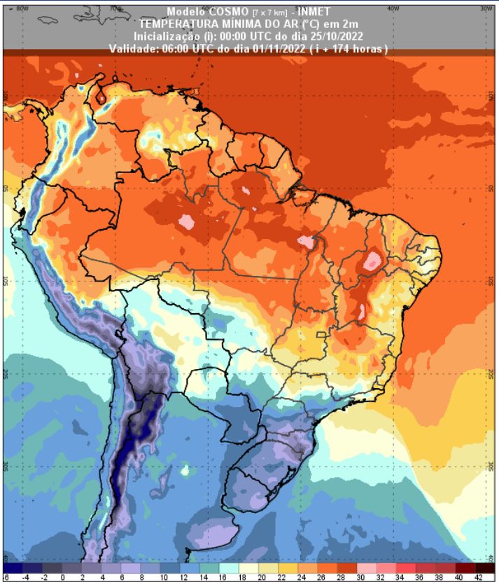 Já na segunda-feira (31) pela manhã, o frio vai atingir o Rio Grande do Sul e parte de Santa Catarina e, até o fim do dia, vai avançar por todo o território catarinense. Também serão afetados o Paraná, o centro-sul do Mato Grosso do Sul e parte de São Paulo. A previsão indica, no início da próxima semana, queda em torno de 15°C na Região Sul. Entre a noite de segunda-feira (31) e a madrugada de terça (1º), também há uma pequena possibilidade de neve entre o Planalto Sul Catarinense e a região dos Aparados da Serra, no Rio Grande do Sul. A figura 2 mostra a previsão de temperatura mínima para a madrugada de terça-feira (1º).
