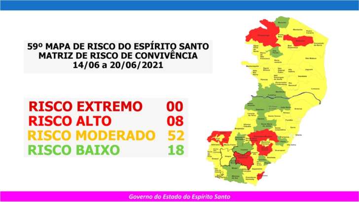 A nova classificação dos municípios passará a valer a partir de segunda-feira (14), e segue até o domingo (20). Dos 78 municípios capixabas, 18 estão classificados em Risco Baixo, 52 em Risco Moderado e oito em Risco Alto.