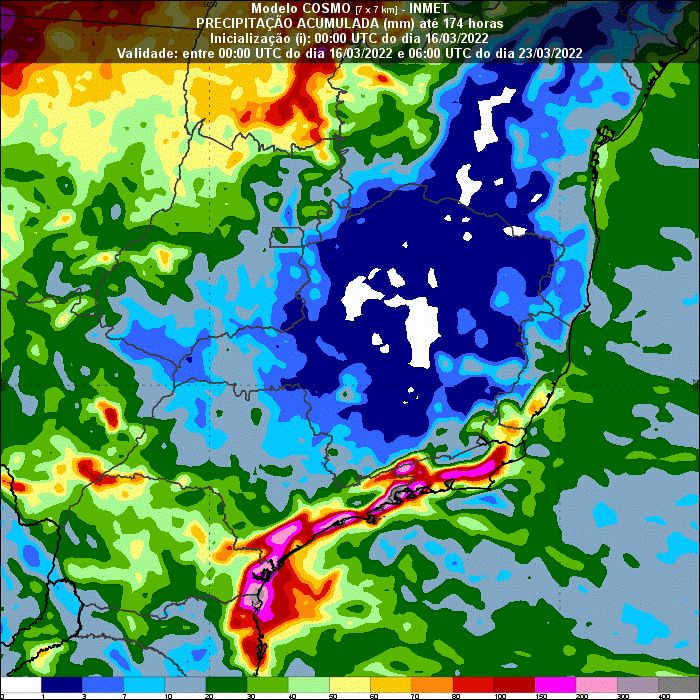Os acumulados de chuva podem superar os 100 mm e os ventos poderão ser maiores que 60 km/h, principalmente em localidades próximas ao litoral. A figura abaixo apresenta a previsão de acumulado de chuva entre os dias 16/03/2022 e 23/03/2022. As áreas em tons de rosa indicam totais de chuva em torno de 200 mm.