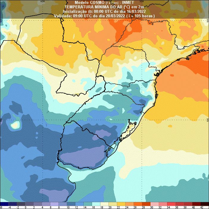 Nas áreas mais altas das serras gaúcha e catarinense, as temperaturas podem ficar próximas a 0°C. A figura acima apresenta a previsão de temperatura mínima para as 6h (horário de Brasília) do dia 20/03 (domingo). Tons em azul escuro indicam temperaturas previstas por volta de 10°C.