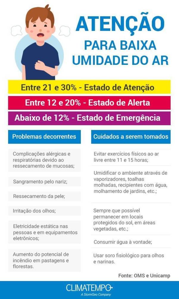 Além do calor intenso, outra preocupação é o ar seco. A umidade relativa ainda vai ficar abaixo dos 20% por várias áreas do Sudeste, Centro-Oeste, interior do Nordeste, no Tocantins, na Região Norte, e no interior do Paraná. Algumas cidades destas regiões podem até registrar valores próximos ou abaixo de 12%, o que caracteriza estado de emergência.
