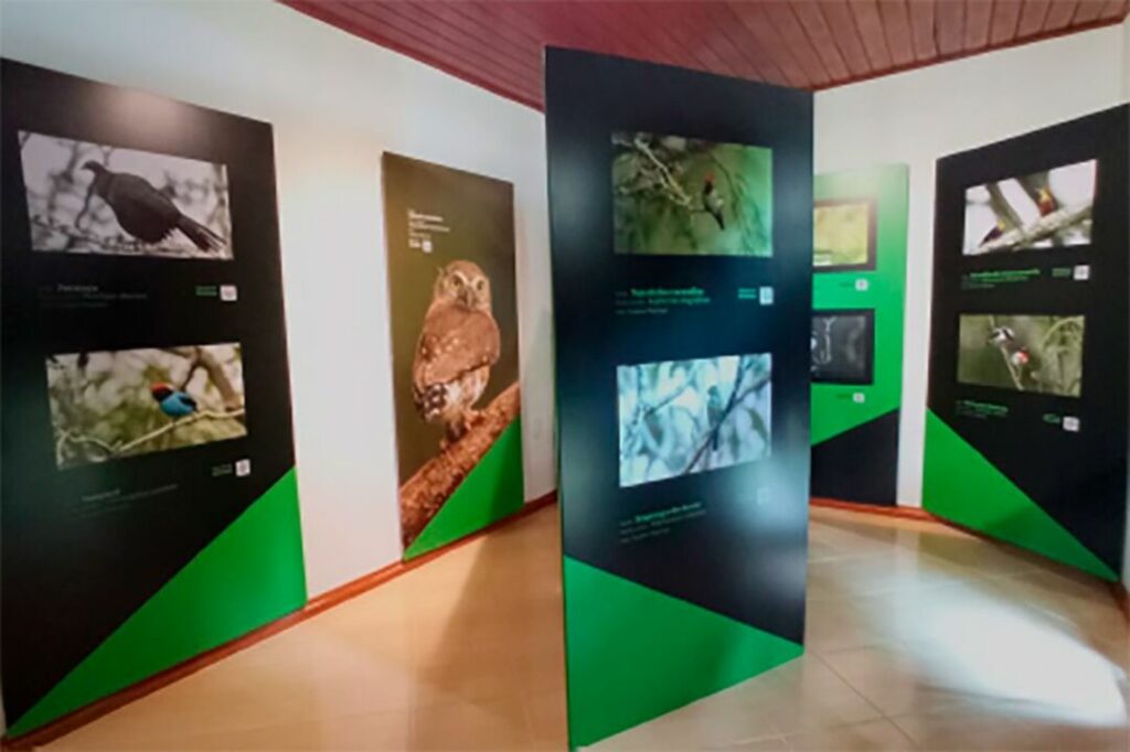 São fotos de aves que chamam atenção pelas suas cores, como o saíra-militar e a saíra beija-flor; outras pela imponência, como o gavião-pato e o gavião-pega-macaco; e ainda pela raridade, como a saíra-apunhalada, além de tucanos, beija-flores, entre outras espécies. Em cada imagem, o visitante encontra um QR-Code que o direciona para uma página com informações completas sobre cada ave, sendo possível, inclusive, ouvir seu canto.