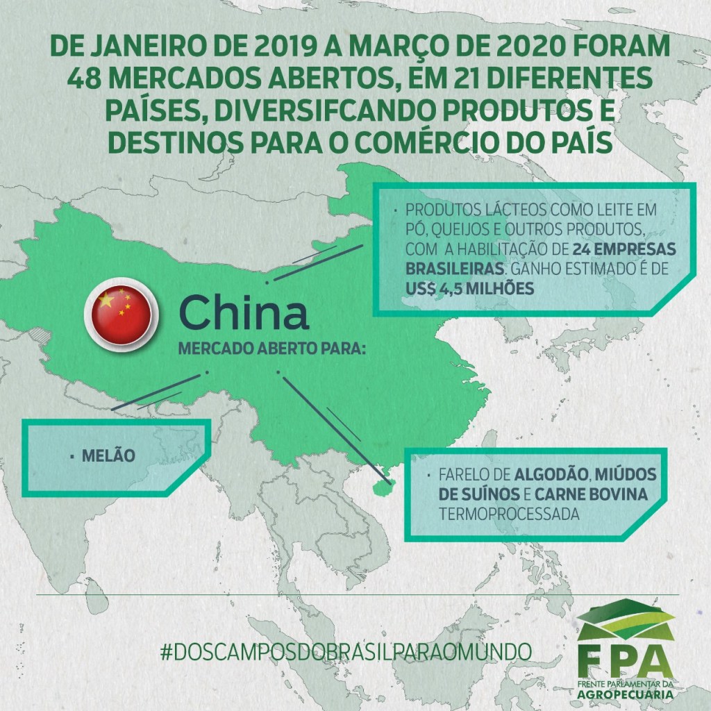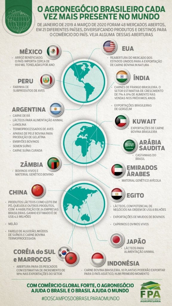 Estes números fazem parte de um levantamento feito pela Frente Parlamentar da Agropecuária (FPA) referente ao trabalho desenvolvido pelo Ministério da Agricultura, Pecuária e Abastecimento (MAPA), responsável pelos avanços na amplitude de mercado para o agronegócio brasileiro.
