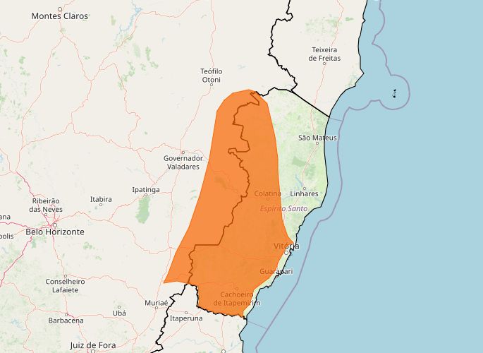 Outro alerta, esse de cor laranja e classificado como “Perigo”, é para ventos de até 100 km/h entre 12h e 20h deste sábado e abrange 65 municípios capixabas e um trecho de Minas Gerais, na região de divisa com o Espírito Santo, e também na divisa com o Rio de Janeiro. O alerta é para as seguintes regiões: Central, Noroeste, Sul e Norte do Espírito Santo, além da Zona da Mata Mineira, Noroeste Fluminense e Norte Fluminense.