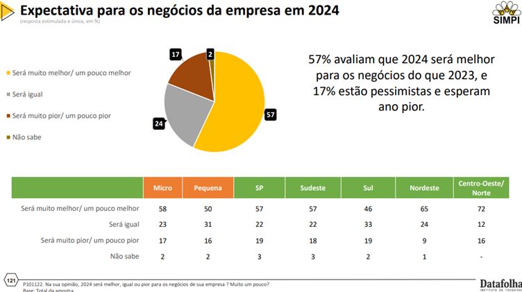 PERSPECTIVAS PARA 2024 – As expectativas para 2024 indicam que 57% das MPIs estão otimistas em relação aos negócios no próximo ano, enquanto 17% mantêm uma perspectiva pessimista. Em um contexto nacional em constante transformação, as regiões Centro-Oeste/Norte lideram o otimismo, com 72%, enquanto São Paulo e o Sul apresentam as maiores taxas de pessimismo, com 19%.
