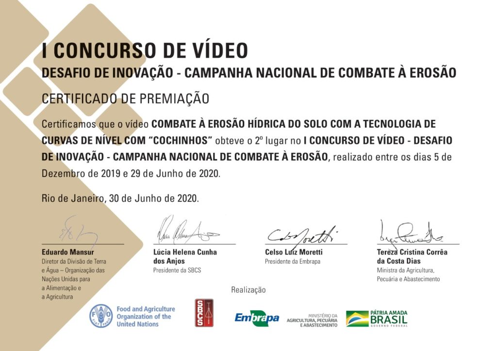 Os três primeiros colocados ganharam um certificado da Embrapa, condecorações da Organização das Nações Unidas para a Alimentação e Agricultura (FAO), do Ministério da Agricultura, Pecuária e Abastecimento (Mapa) e da Sociedade Brasileira de Ciência do Solo (SBCS), além de um kit da campanha ‘Stop soil erosion’ da FAO, com 10 publicações do organismo da ONU e da Embrapa.