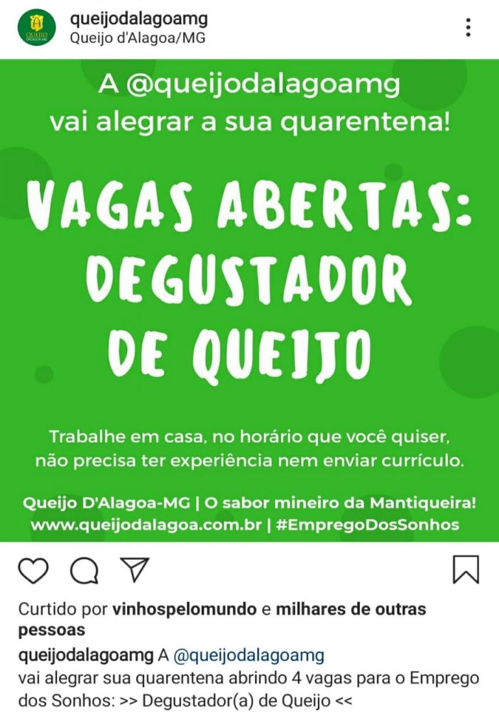 Uma pequena empresa de Alagoa, no sul de Minas Gerais, abriu quatro vagas para degustador de queijo. O recrutamento será feito via sorteio e os escolhidos receberão em casa um kit contendo queijos premiados. São eles: o queijo “Alagoinha”, o queijo “Sô Batistinha”, o queijo “Tio Zé” (maturado), o queijo “Alagoa Pequena” (premiado na França), o queijo “Alagoa Fumacê”, o queijo “Coronel” e o queijo “Faixa Dourada” (premiado com medalha de Ouro e Super Ouro no III Prêmio Queijo Brasil), sendo este último eleito o melhor queijo artesanal de leite cru do Brasil.