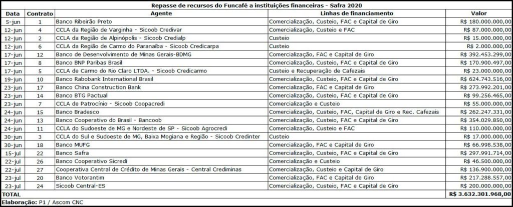 Conforme apuração do Conselho Nacional do Café (CNC), com os repasses realizados para Sicredi, Central Crediminas, Banco Votorantim e Sicoob Central-ES, o volume do Funcafé disponibilizado a 21 instituições financeiras chega a R$ 3,632 bilhões, ou 63,6% do total de R$ 5,710 bilhões para o ciclo cafeeiro atual.