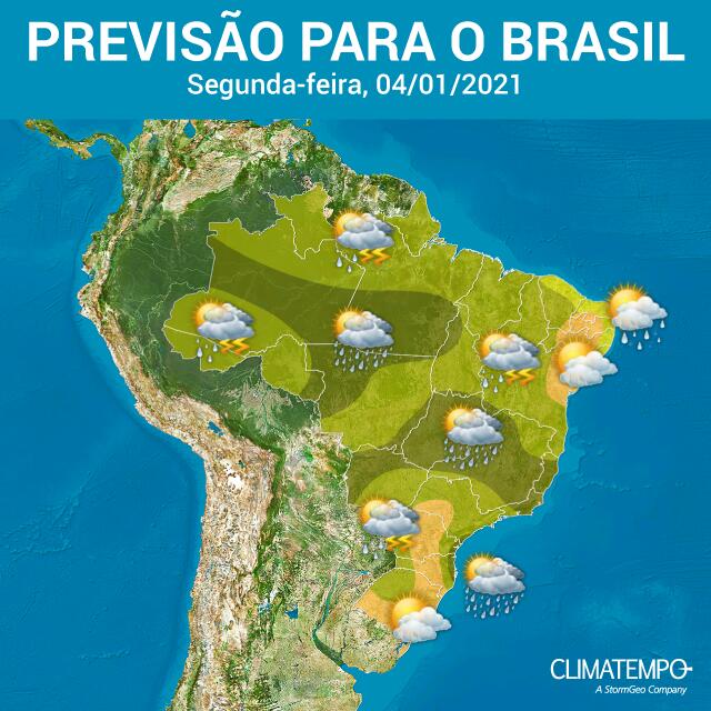 Nesta segunda-feira (04), uma grande faixa de nebulosidade persiste entre os estados do Sudeste, Goiás, Mato Grosso, na maior parte da Região Norte e também oeste da Bahia e no Maranhão. Por outro lado, uma massa de ar seco permanece sobre estados do Sul, no oeste de SP e Mato Grosso do Sul, e também sobre áreas do Nordeste.