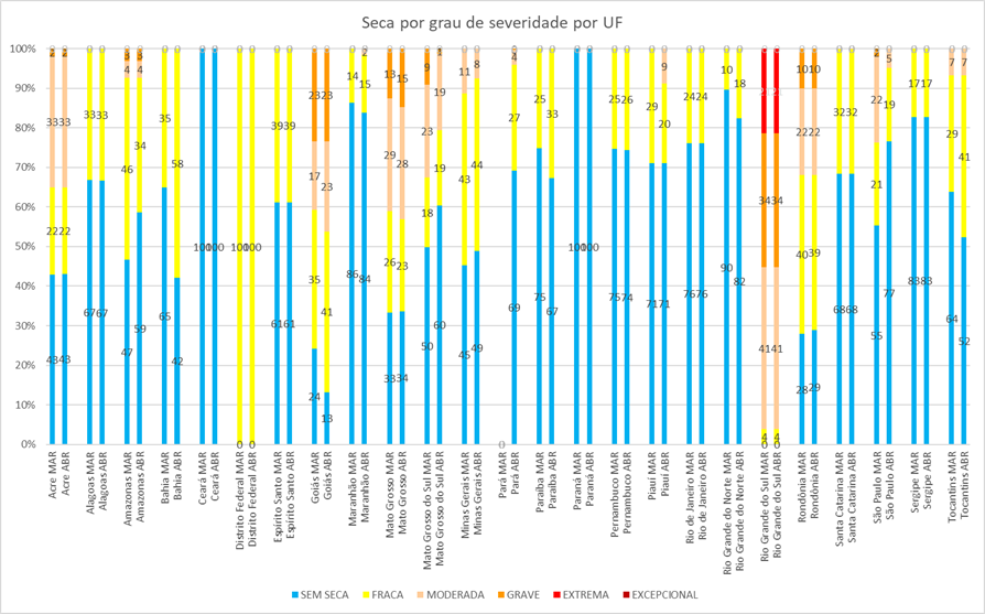 Duas unidades da Federação registraram seca em 100% do território em abril: Distrito Federal e Rio Grande do Sul; sendo que para percentuais acima de 99% considera-se a totalidade dos territórios com seca. Nas demais unidades da Federação os percentuais variaram de 0% a 87%.