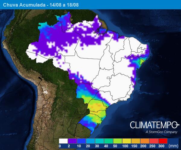 Já no sudoeste de Mato Grosso, no oeste e sul de São Paulo, as pancadas são mais isoladas. O interior paulista, o sul de Goiás e todo o centro-leste de Mato Grosso continuam sem grandes mudanças, e o tempo segue firme e seco e baixa umidade relativa do ar, pelo menos até a quarta-feira.