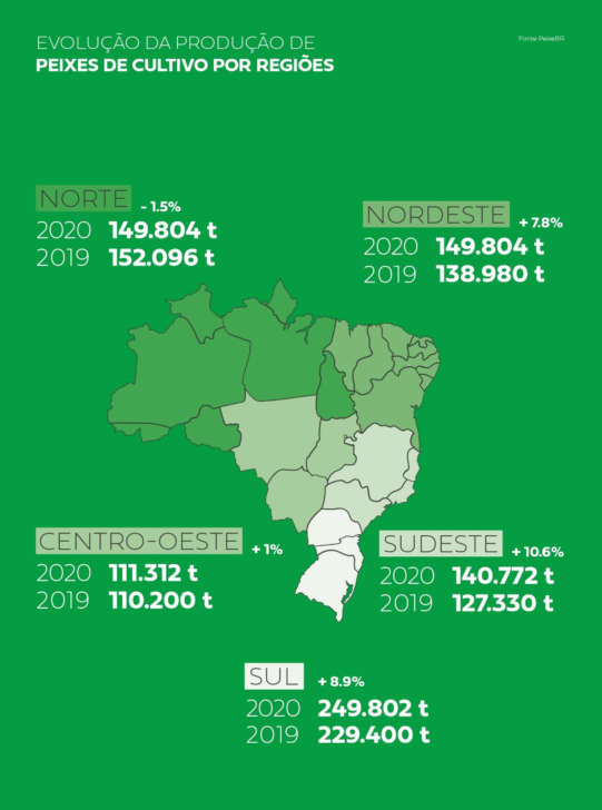A produção brasileira de peixes de cultivo deslocou-se ligeiramente em 2020. Levantamento da Associação Brasileira da Piscicultura (Peixe BR) mostra consolidação do Sul como região mais importante: 31,1% do total (participava com 30,3% em 2019) e produção de 249.802 t.