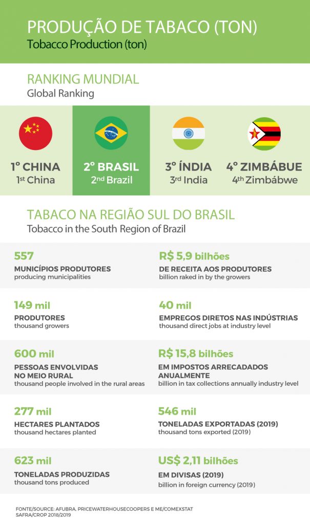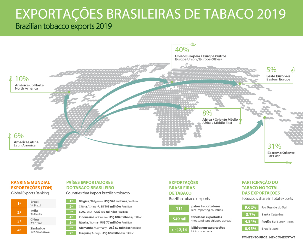 O Brasil é líder mundial em negócios com tabaco e detentor de 25% das vendas do produto no planeta. O país fechou 2019 com US$ 2,14 bilhões e 549 mil toneladas em exportações, segundo dados do Ministério da Economia. Um aumento significativo, uma vez que os números finais revelaram o aumento de 7,6% em dólares e de 19% no volume de tabaco embarcado em relação ao ano anterior (2018), quando haviam sido embarcadas 461 mil toneladas, gerando US$ 2 bilhões em divisas.
