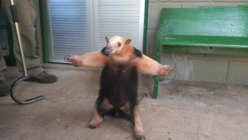 De acordo com a equipe da Fiscalização Ambiental, o Tamanduá-mirim – também conhecido como Tamanduá de colete – encontra-se em bom estado de saúde e já iniciou sua jornada de reabilitação.