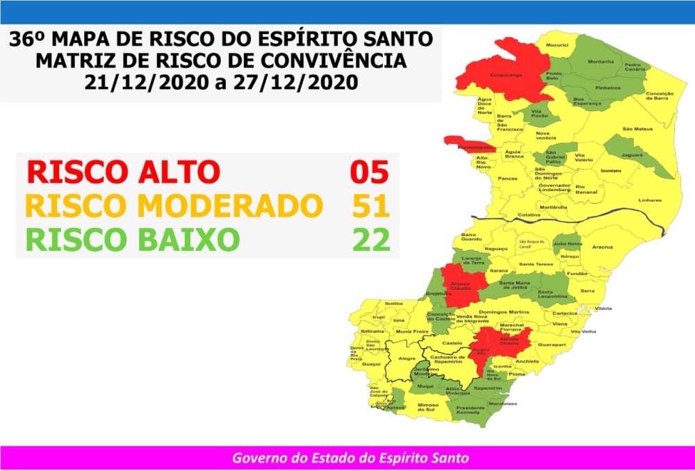 Desta vez, cinco municípios estão na classificação de risco alto: Afonso Cláudio, Alfredo Chaves, Vargem Alta, Mantenópolis e Ecoporanga. Dos cinco, três são da Região Serrana do Estado. A partir da próxima semana, Domingos Martins, Anchieta, Marilândia e Ibiraçu, que ainda estão em risco alto, passaram a integrar os municípios com classificação de risco moderado, junto com outros 51 municípios. Na classificação de risco baixo estão os demais 22 municípios.