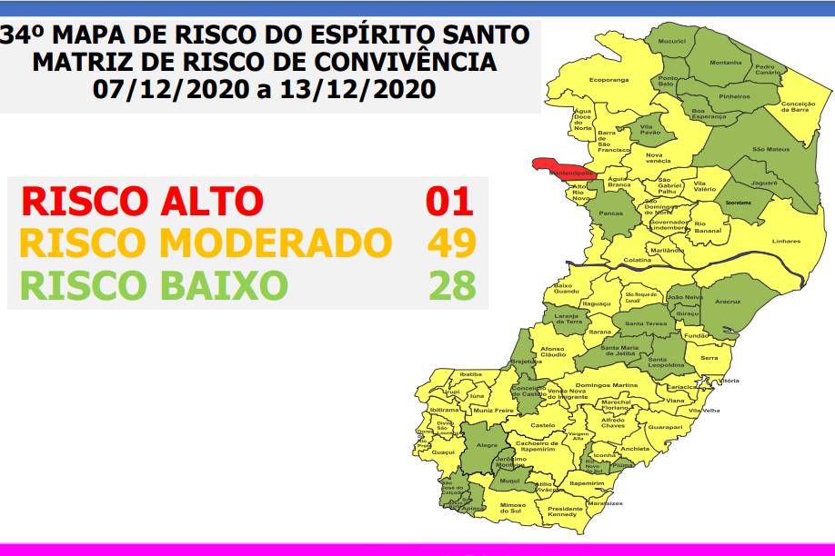 O Mapa de Risco segue as orientações dos boletins epidemiológicos do Ministério da Saúde e recomendações da equipe de especialistas do Centro de Comando e Controle (CCC) Covid-19 no Espírito Santo, que é composto pelo Corpo de Bombeiros Militar, Defesa Civil, Secretaria da Saúde (Sesa), Instituto Jones dos Santos Neves (IJSN), da Universidade Federal do Espírito Santo (Ufes) e do Instituto Federal do Espírito Santo (Ifes). As decisões adotadas pelo Governo do Estado seguem parâmetros técnicos. O novo mapa de risco entra em vigor na próxima segunda-feira (7).
