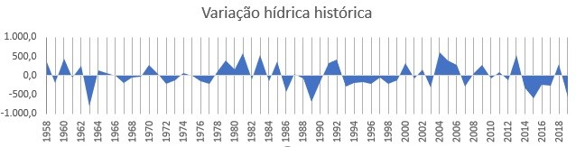 Gráfico 01. Variação Hídrica histórica com linha de tendência definida por média de 10 anos