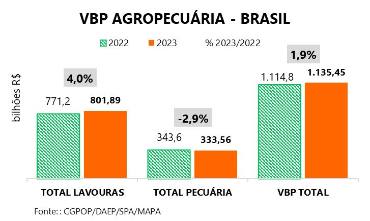 O Valor Bruto da Produção Agropecuária (VBP) deste ano, com base nas informações de julho, é de R$ 1,135 trilhão, alta de 1,9% em relação ao ano de 2022. As lavouras cresceram 4% e a pecuária reduziu seu crescimento em 2,9%. O faturamento das lavouras é de R$ 801,9 bilhões e o da pecuária foi de R$ 333,6 bilhões.
