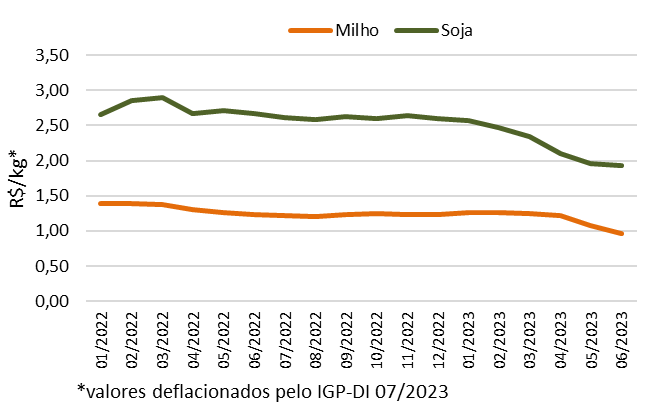 Ao longo destes últimos 18 meses, observou-se que o VBP tem crescido a taxas relativamente menores. Pode-se atribuir esse decréscimo do crescimento real do VBP aos preços de milho e soja que têm apresentado tendência de redução (gráfico)