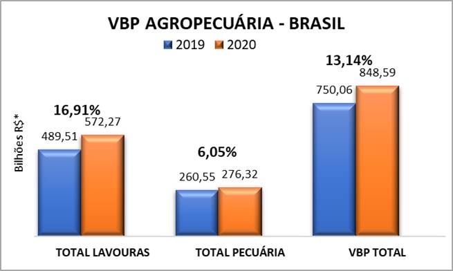 A poucas semanas para o fim do ano, o Valor Bruto da Produção Agropecuária (VBP) de 2020 está estimado em R$ 848,6 bilhões, alta de 13,14% em relação ao ano anterior. Desse valor, R$ 572,27 bilhões referem-se às lavouras e R$ 276,32 bilhões à pecuária. As lavouras tiveram um aumento real de 16,9% e a pecuária, 6,1%, em relação a 2019.