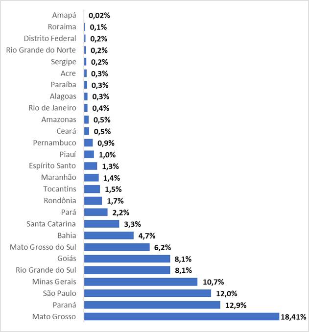 VBP REGIONAL – Em relação aos estados, cinco lideram o ranking: Mato Grosso (18,4%), Paraná (12,9%), São Paulo (12%), Minas Gerais (10,7%) e Rio Grande do Sul (8,1%).