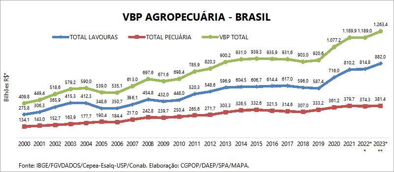 O VBP estimado para 2023 é 6,3% maior que o de 2022, podendo atingir R$ 1,263 trilhão. As lavouras devem ter um aumento real de 8,3%, e a pecuária de 1,9%.