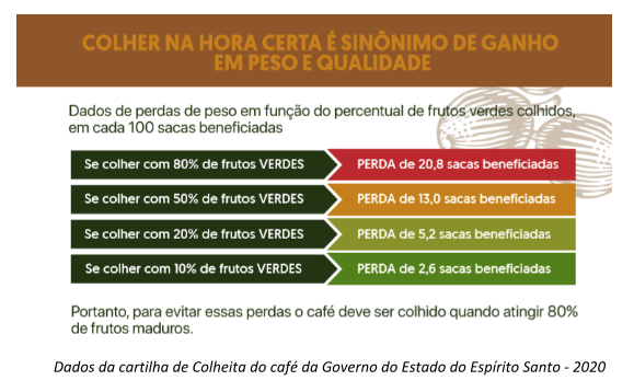 A cartilha do Governo do Espírito Santo compartilhou uma tabela que informa o percentual de perda em sacas beneficiadas, de acordo com a quantidade de frutos verdes durante a apanha.