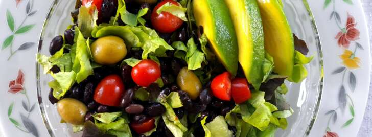2. Arrume por cima das folhas, o abacate, o feijão, as azeitonas e os tomates.