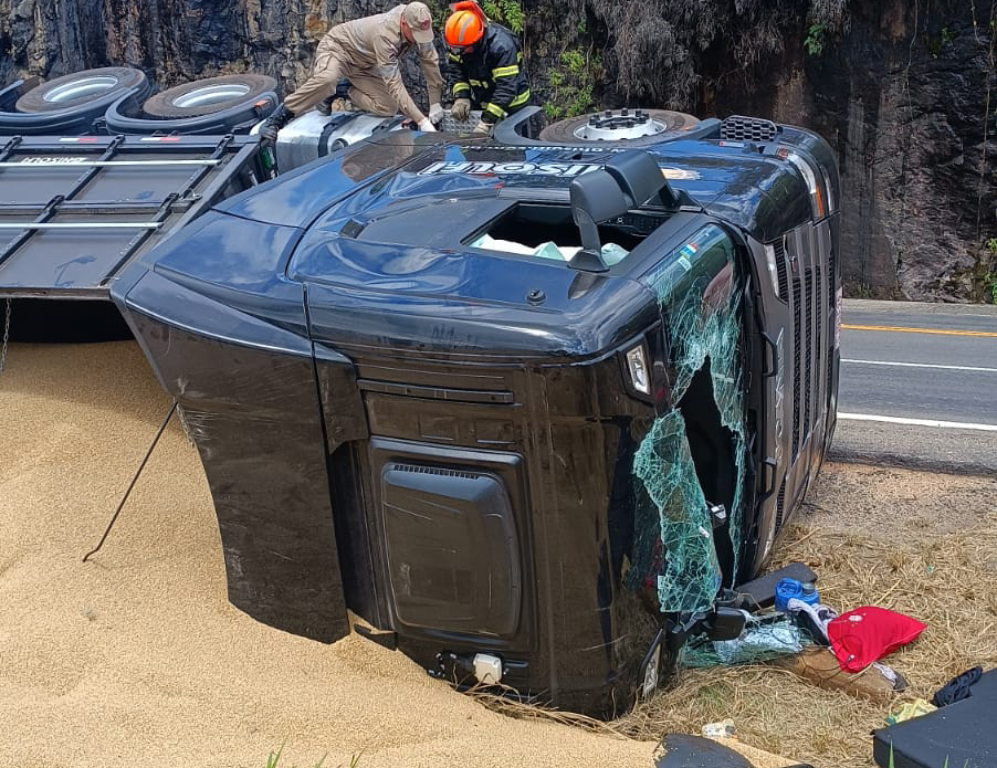 Foto: Corpo de Bombeiros Texto: Julio Huber Uma carga de cevada, que era transportada do Porto de Vitória, na capital capixaba, para Minas Gerais, ficou espalhada às margens do km 34 da BR-262, na entrada ao distrito de Biriricas, em Domingos Martins, após uma carreta tombar em um trecho de curva. O acidente aconteceu no…